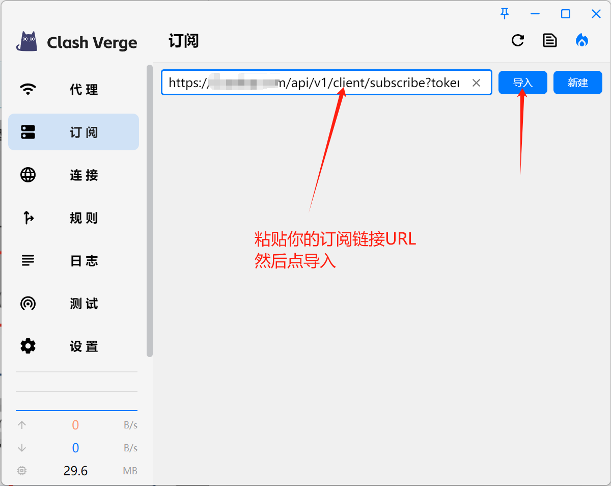 将订阅链接/URL链接粘贴在文本框中,然后点导入